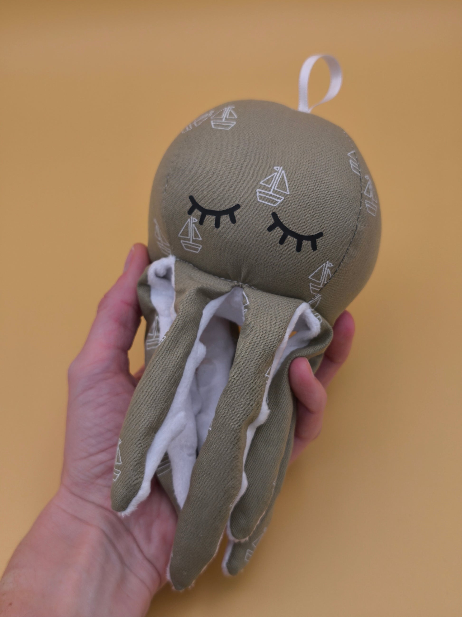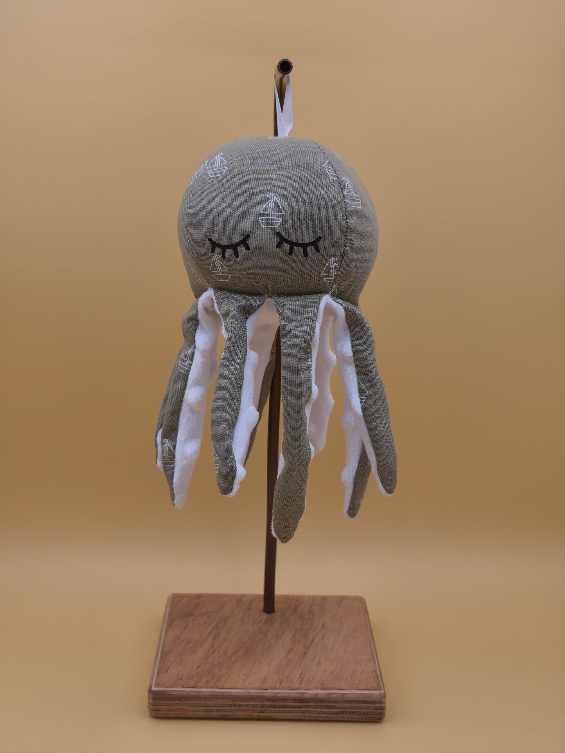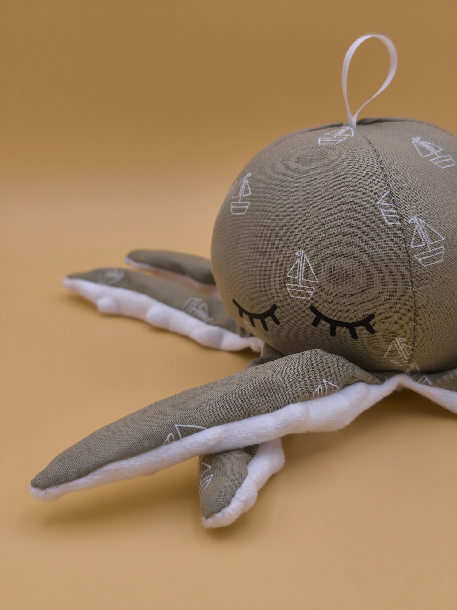 Entièrement confectionné à la main, il est arbore un tissu tendre en coton à motifs voilier blanc sur fond kaki . Son petit air endormi et ses huit tentacules détaillées (même les ventouses y sont !) créent une ambiance calme et unique. C'est l'objet idéal pour une décoration qui raconte une histoire.
