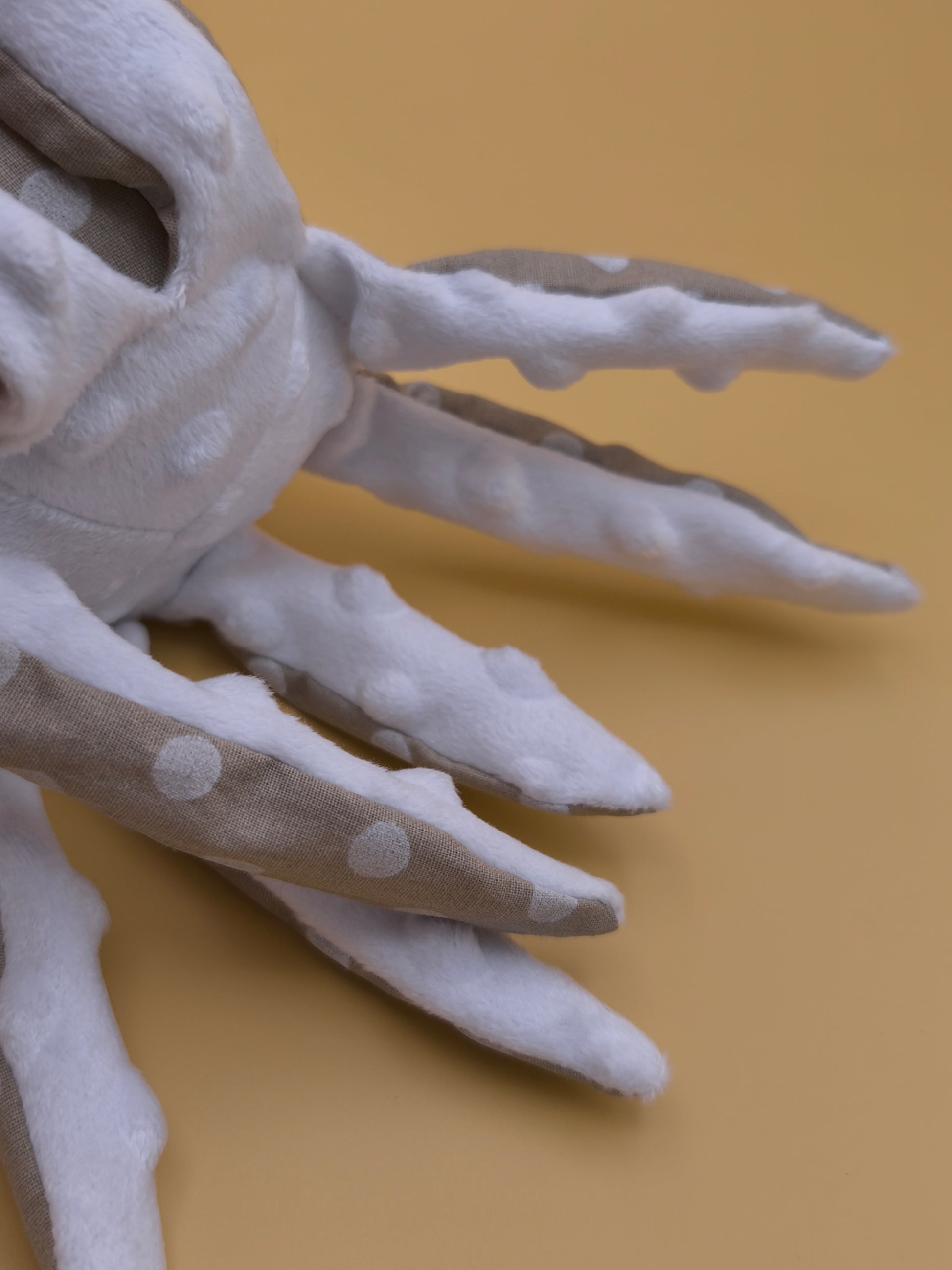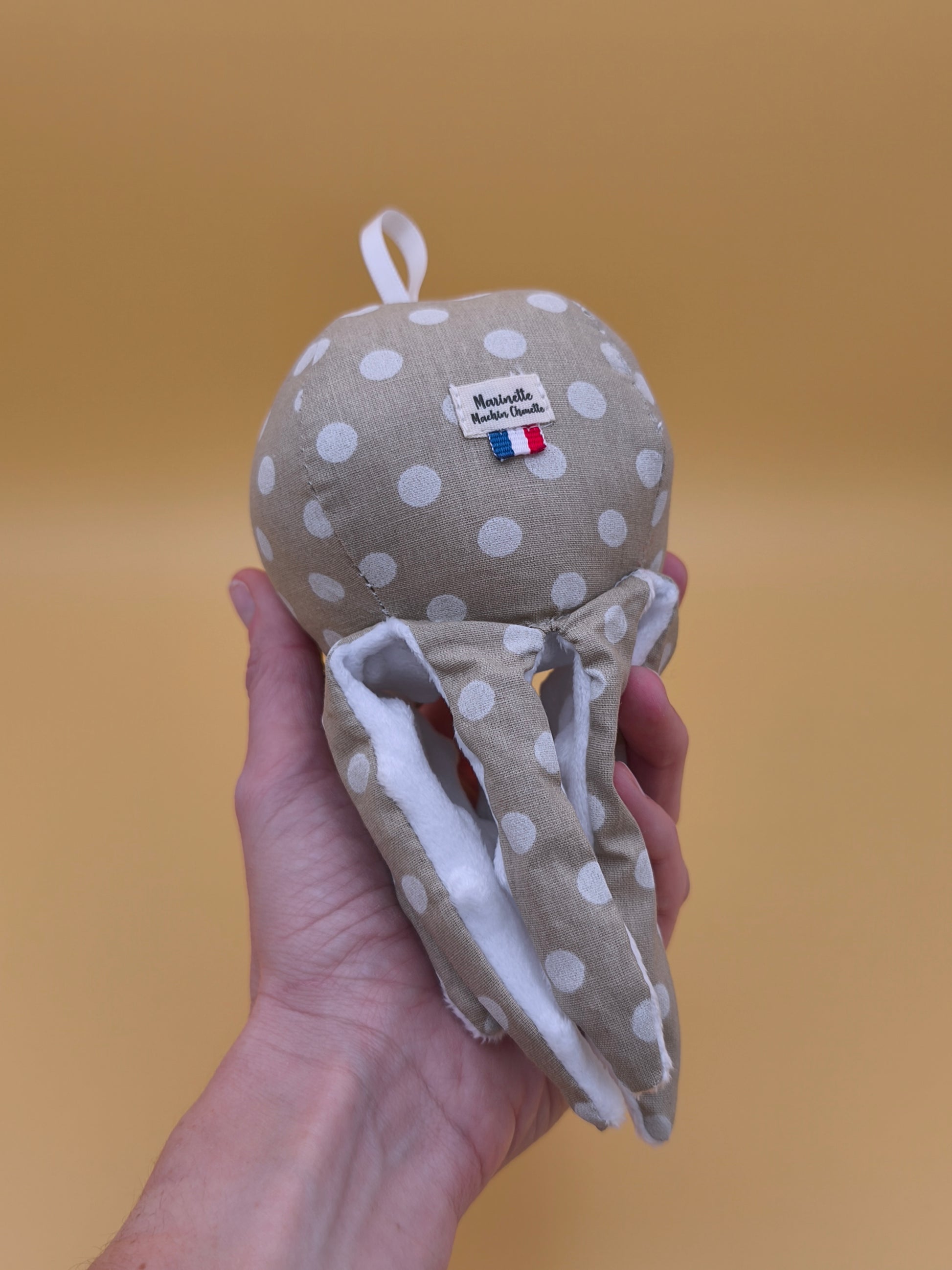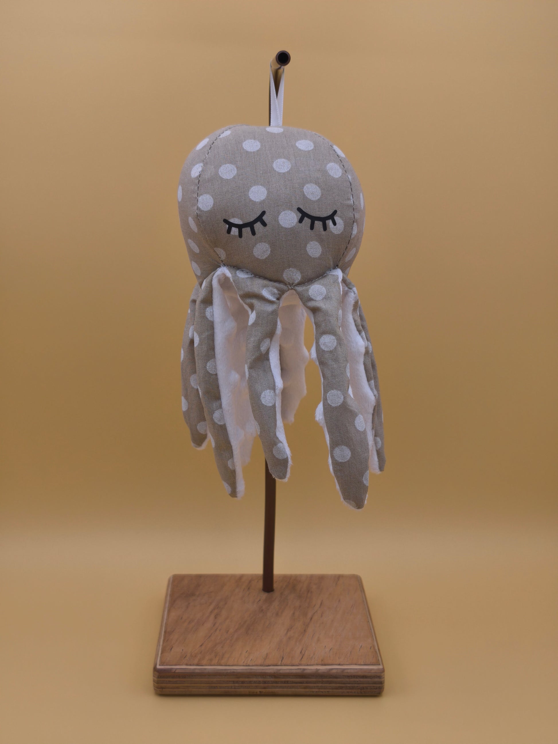 Entièrement confectionné à la main, il est arbore un tissu tendre en coton à pois blanc sur fond beige. Son petit air endormi et ses huit tentacules détaillées (même les ventouses y sont !) créent une ambiance calme et unique. C'est l'objet idéal pour une décoration qui raconte une histoire.